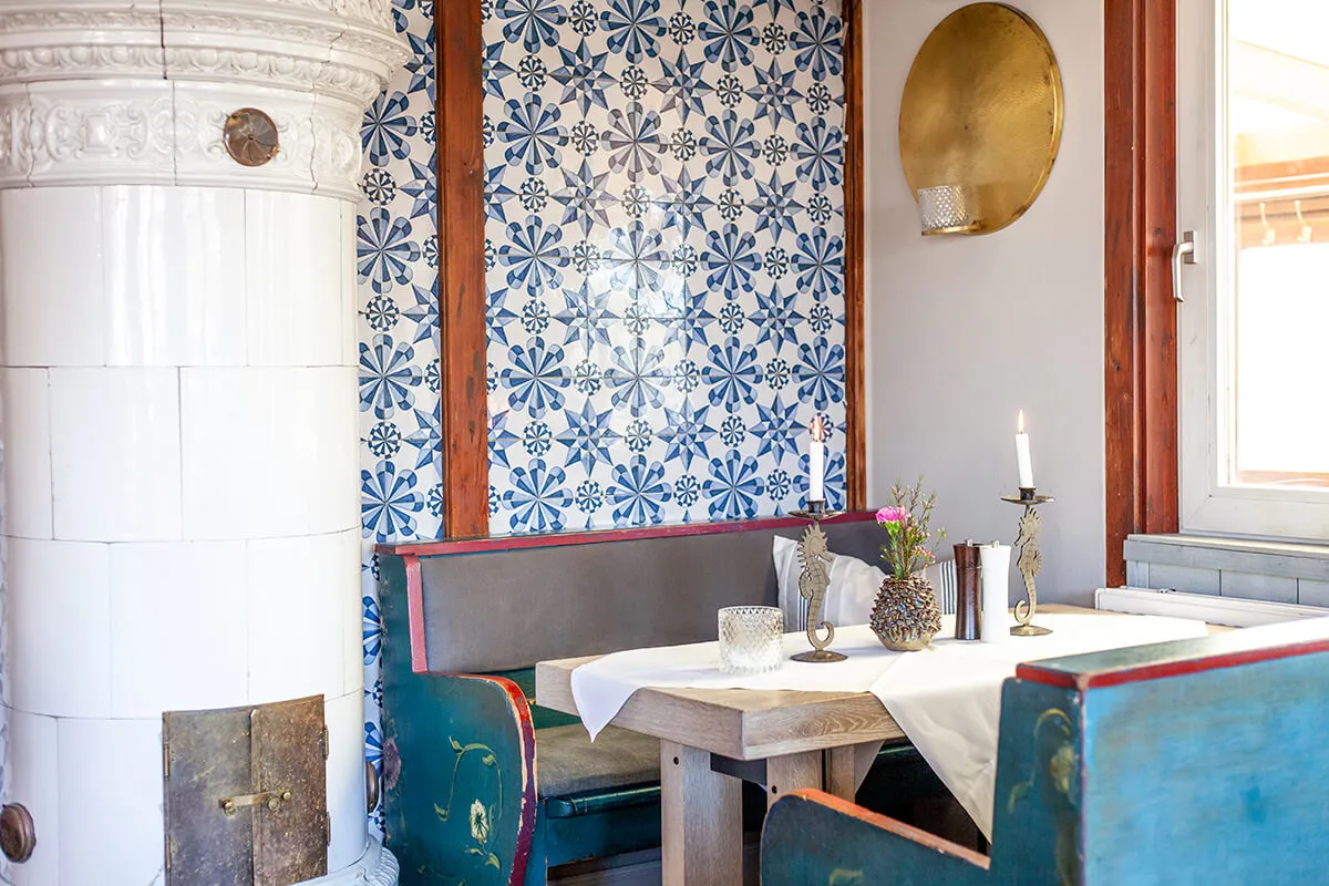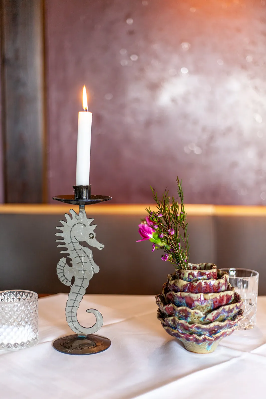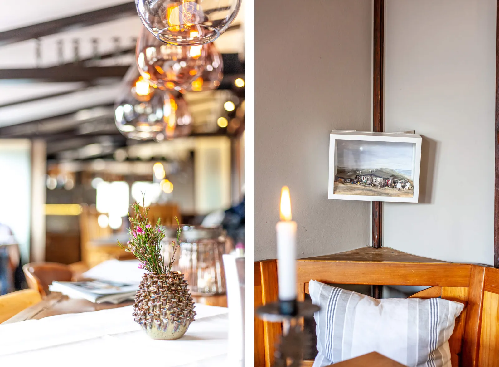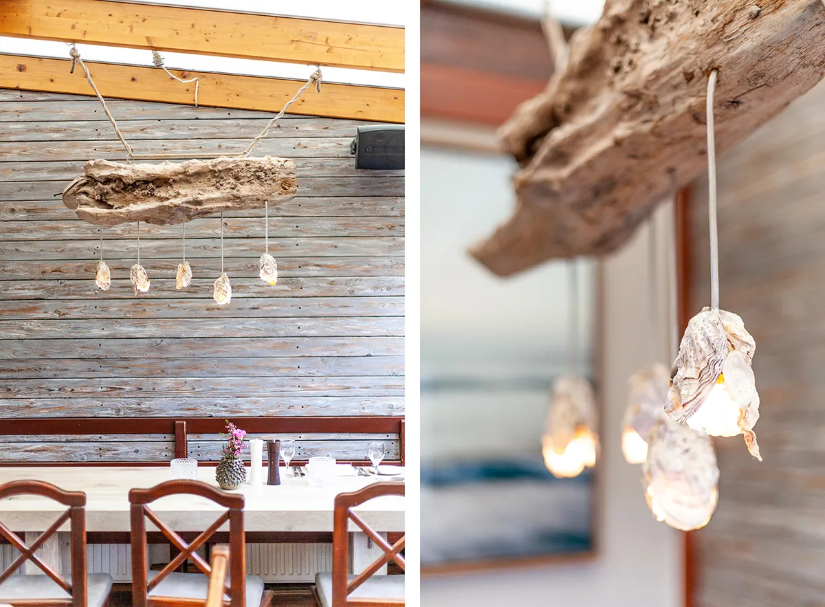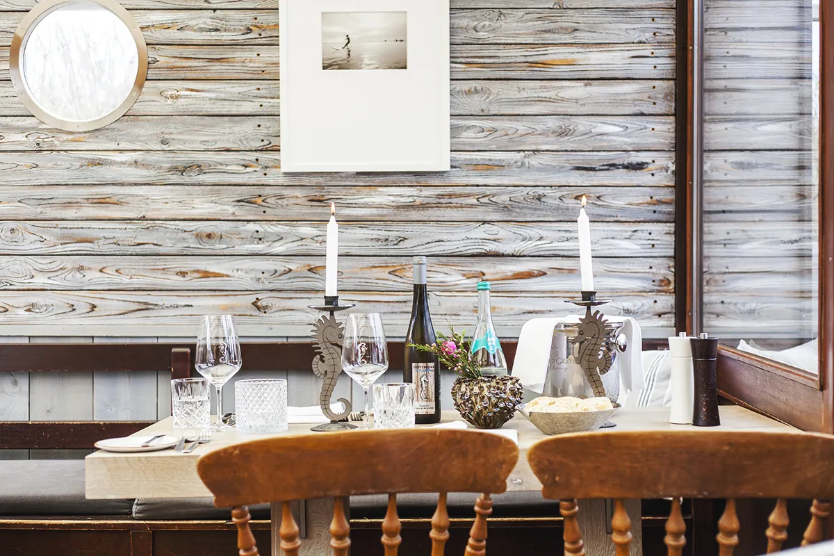 Der muckelige Innenbereich des Restaurants ist mit viel Liebe zum Detail gestaltet. Historische Dielen, urige Balken, alte Fliesen und ein lichtdurchfluteter Wintergarten verleihen dem Restaurant eine große Portion Gemütlichkeit. Wenn du genau hinschaust, entdeckst du in fast jeder Ecke kleine Seepferdchen.