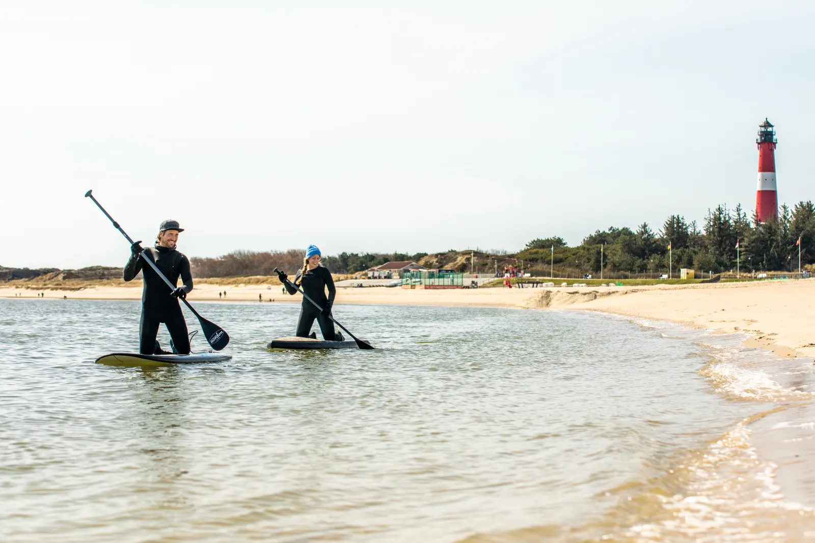 Wir schweben im Stehen bis zur Hörnum-Odde. Hier draußen hört man nichts außer Möwenkreischen, kann die Muschelkutter beim Ein- und Ausfahren beobachten, die frische Luft atmen und mit jedem Paddelschlag mehr loslassen. Loslassen vom Alltagsstress, der sich an Land abspielt. Spätestens beim Anblick des Leuchtturm-Panaromas machen sich Glücksgefühle in mir breit. Die helfen mir auch dabei, auf dem Rückweg gegen leichten Wind anzukommen. Ich sag nur: Moin, Muskelkater!