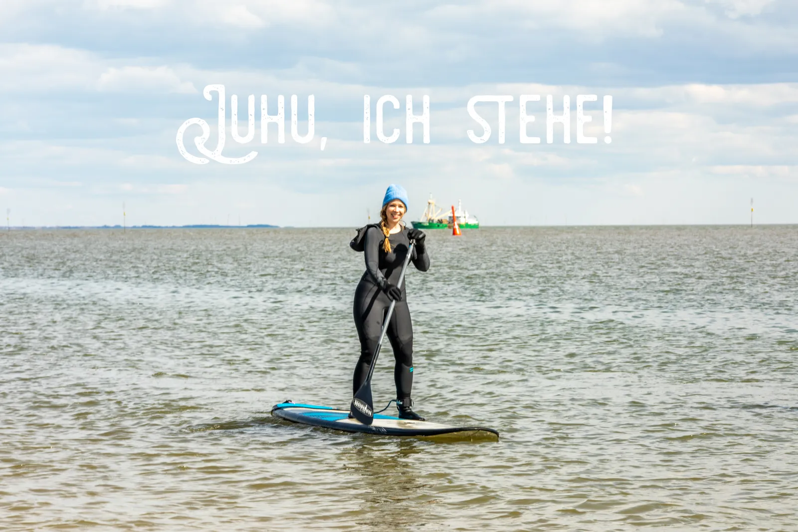 Auf dem Weg zum Flutsaum bekomme ich langsam Muffensausen und sehe mich schon ins Wasser plumpsen. Wir bewegen uns ein paar Meter vorwärts, bis wir etwa knietief in der Nordsee stehen. Zunächst steige ich vorsichtig mit den Knien auf das Brett und bleibe erst einmal sitzen. Puh, erster Schritt geschafft! Je nachdem, in welchem Winkel und wie tief ich nun das Paddel ins Wasser eintauche, komme ich besser oder schlechter voran.