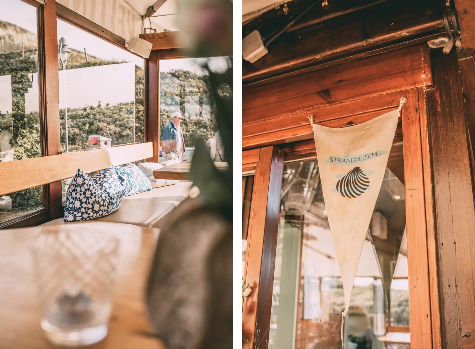 Bei schönem Wetter mache ich es mir hier am liebsten in einem der Strandkörbe oder auf den Holzbänken gemütlich, denn von dort aus reicht der Blick über die grüne und mit Heckenrosen gespickte Landschaft hinter den Dünen. An Schlechtwettertagen oder bei einer frischen Brise kuschle ich mich einfach in den kleinen, aber feinen Innenraum.