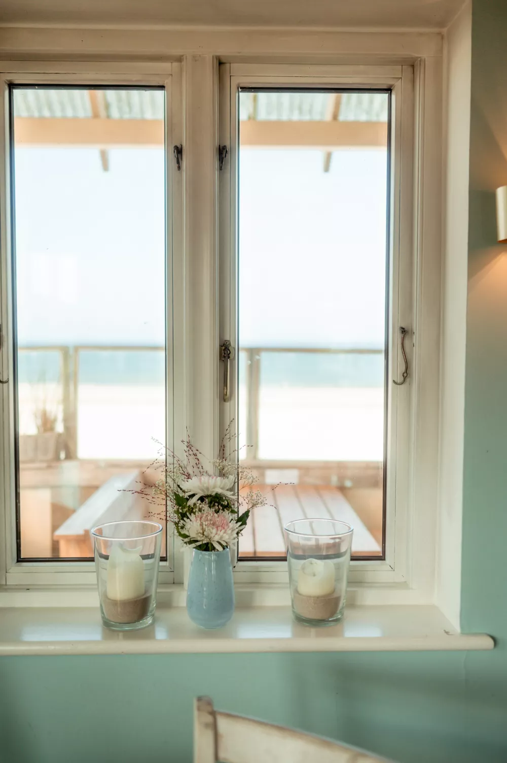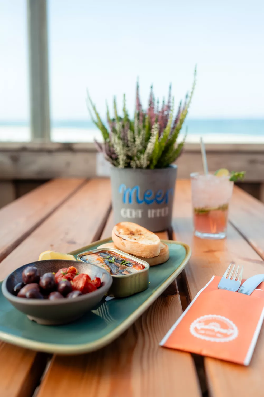 Die Atmosphäre ist gemütlich und einladend, die Tische und Wände sind liebevoll dekoriert und mit schönen Bildern versehen, sodass man sich sofort wohlfühlt. Und dann der Ausblick! Von der Terrasse blickt man direkt auf das Meer – Urlaubsfeeling pur.