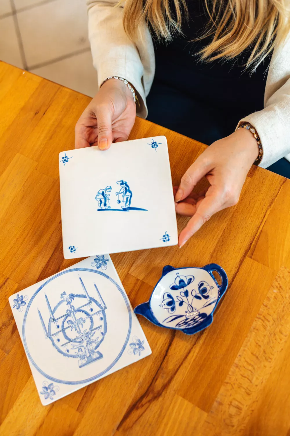 Ein echtes Highlight ist die neue Kooperation mit dem Sylt Museum: Nina hat historische Delfter Fliesen mit exklusiv angefertigten Schablonen originalgetreu nachgemalt. Aus dem Projekt sind wunderschöne Fliesen-Souvenirs entstanden mit friesischen Motiven wie dem Jöölboom und kleine Teetassen-Schalen. Jede gebrannte Keramikfliese ist ein echtes Unikat und in limitierter Stückzahl im Museumshop in Keitum oder bei HB Jensen zu erwerben. Der Erlös wird an die Sölring Foriining gespendet. Richtig besonders!