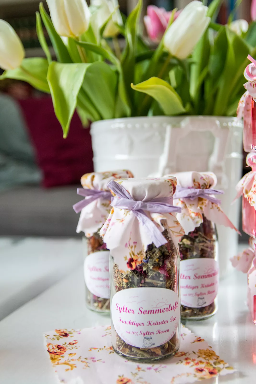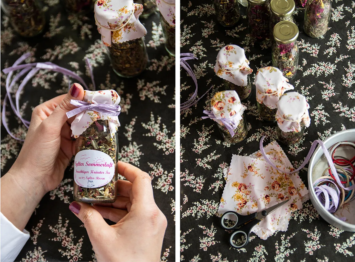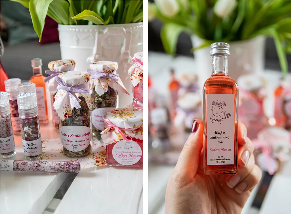 Überall stehen Glasfläschchen, gefüllt mit süßem Sirup, Rosensalz und Kuchen im Weckglas. Obwohl Mareike ihre Produkte in einer separaten Küche herstellt: ihr Wohnzimmer ist der kreative Ort, an dem sie Etiketten klebt, Schleifen bindet und ihre Produktverpackungen liebevoll aufbereitet. Natürlich möchte ich mehr über ihr Geschäft mit den Rosen erfahren. Bei einer Tasse Kaffee kommen wir zwischen Schleifen und Etiketten ins Gespräch.