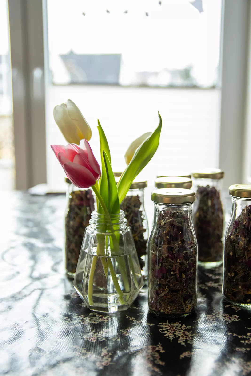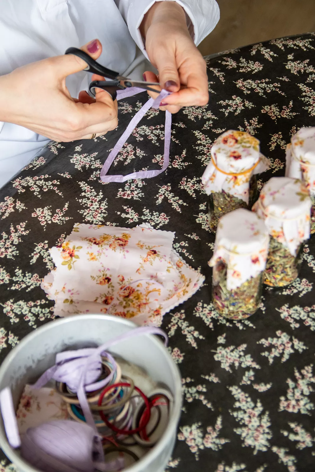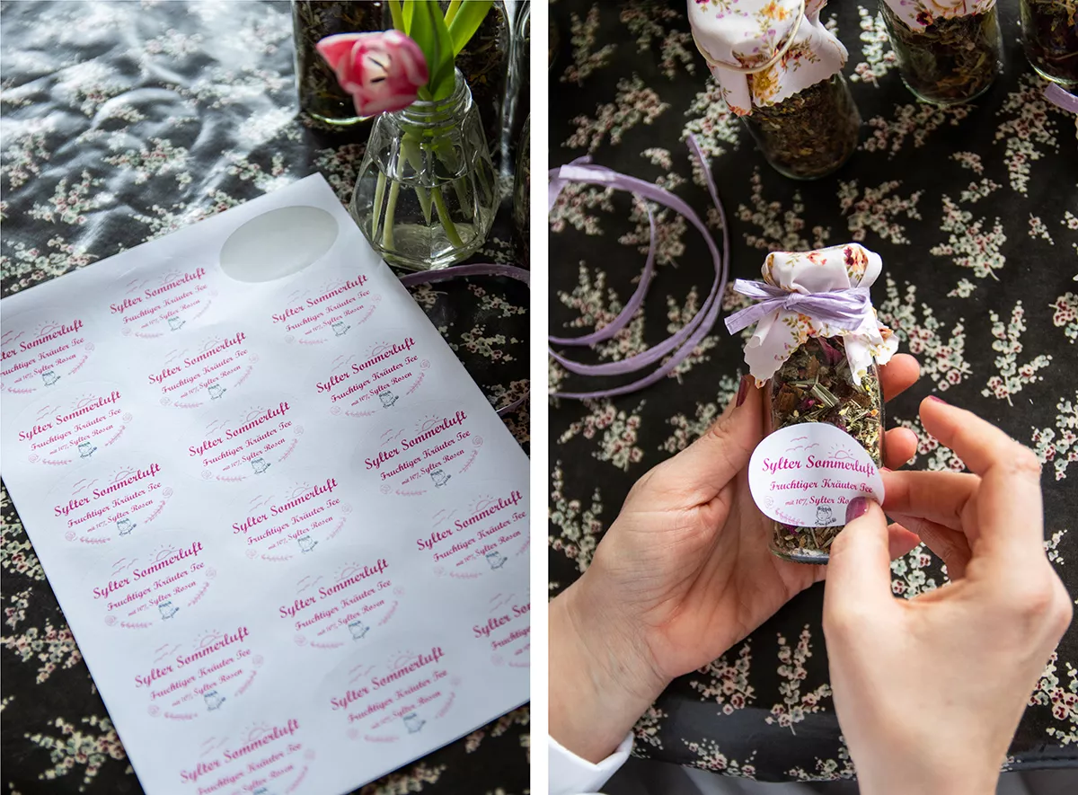 Überall stehen Glasfläschchen, gefüllt mit süßem Sirup, Rosensalz und Kuchen im Weckglas. Obwohl Mareike ihre Produkte in einer separaten Küche herstellt: ihr Wohnzimmer ist der kreative Ort, an dem sie Etiketten klebt, Schleifen bindet und ihre Produktverpackungen liebevoll aufbereitet. Natürlich möchte ich mehr über ihr Geschäft mit den Rosen erfahren. Bei einer Tasse Kaffee kommen wir zwischen Schleifen und Etiketten ins Gespräch.