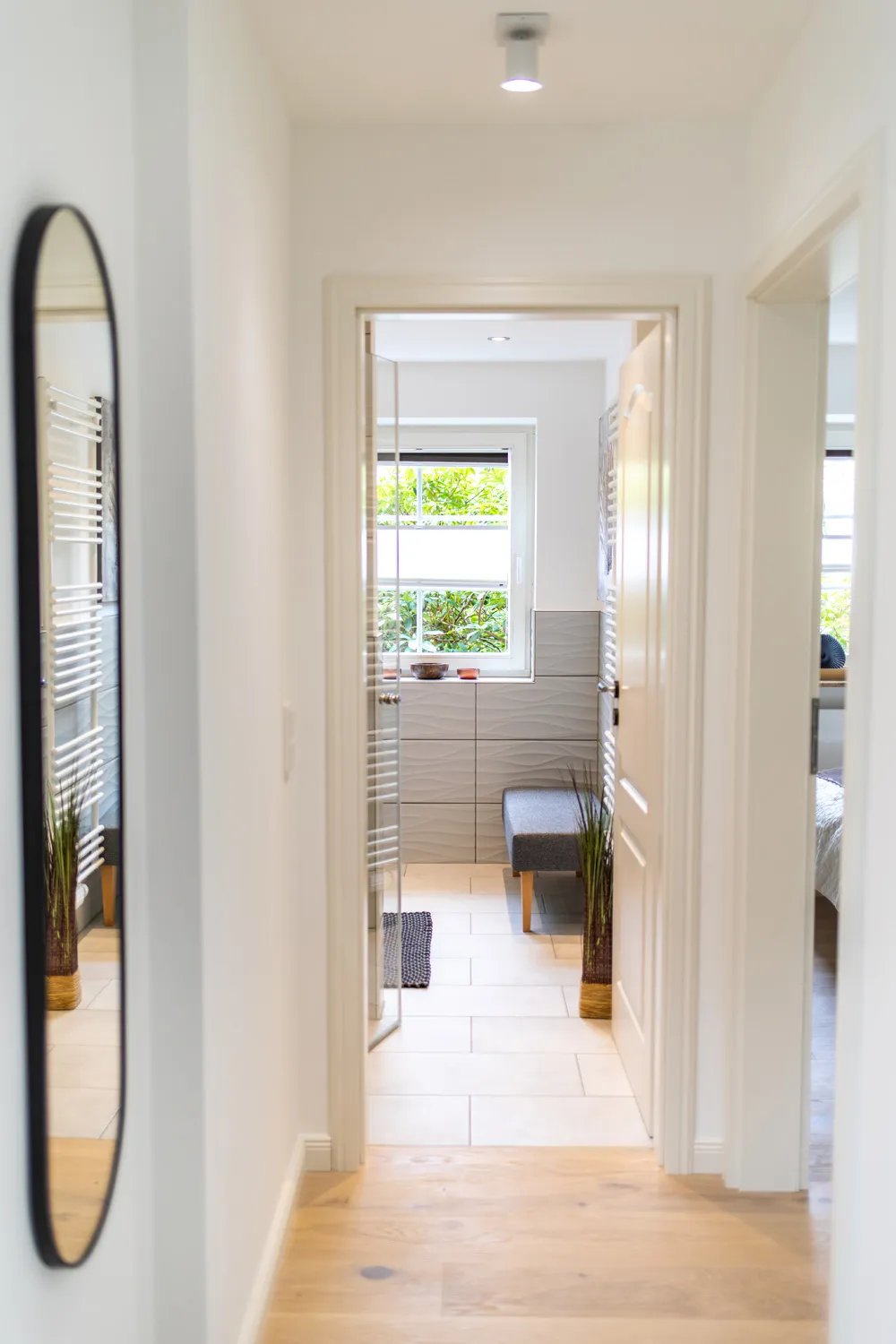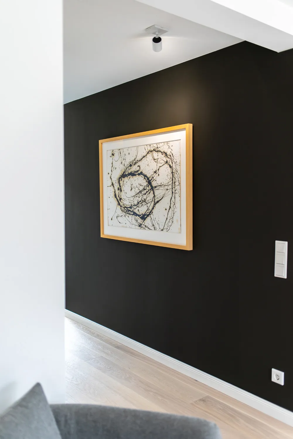 Hinter der Eingangstür eröffnet sich ein offenes und luftiges Raumkonzept. Das stilvolle und zeitlose Interieur mit schwarzen Akzenten, dezenter Dekoration, hochwertiger Kunst und Möbeln geben mir deutlich zu verstehen, dass ich mich hier in einem 5-Sterne-Luxusdomizil befinde.