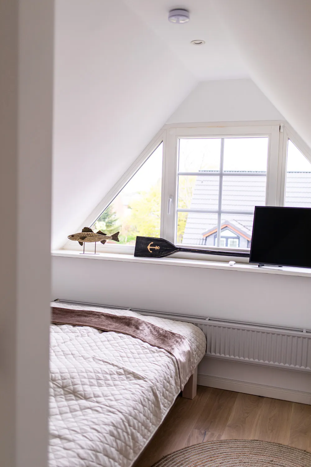 Umrahmt von Grün der Tinnumer Deichwiesen, liegt das Ferienhaus Seascape III inmitten einer ruhigen Wohnsiedlung. Schon von außen fällt mir die Bauweise sofort ins Auge: Hinter der großzügigen Auffahrt für gleich zwei Autos sticht ein hoher, schmaler und spitz zulaufender Giebel hervor. Sowas habe ich zuletzt in den Märchenbüchern meines kleinen Neffen gesehen – wirklich einzigartig!