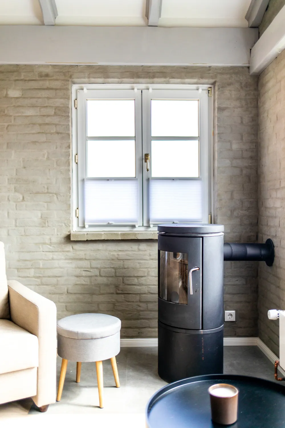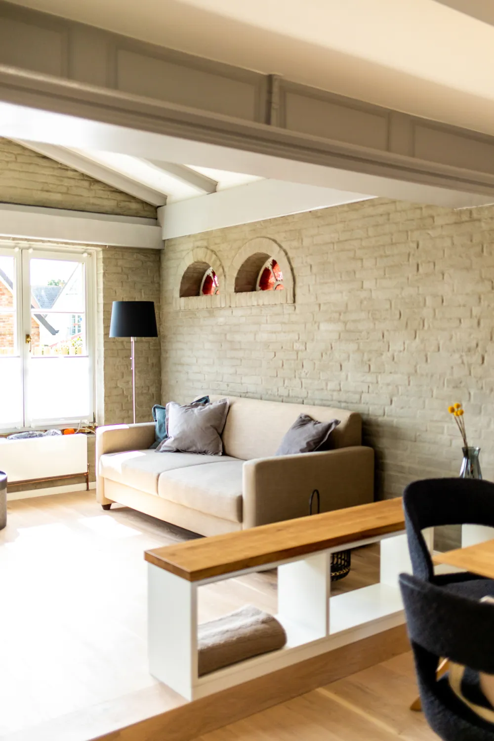Im hellen und zeitlos schönen Ferienhaus Sylt Seascape IV HoogeBay überraschen rustikale Elemente wie die Holzbalken oder die Steinwand im Wohnbereich. Diese Elemente haben die Wolters bei der Renovierung neu aufbereiten lassen, sodass sie sich geschickt in das neue, moderne Raumkonzept einfügen. Ich finde diese Kombi super gemütlich!