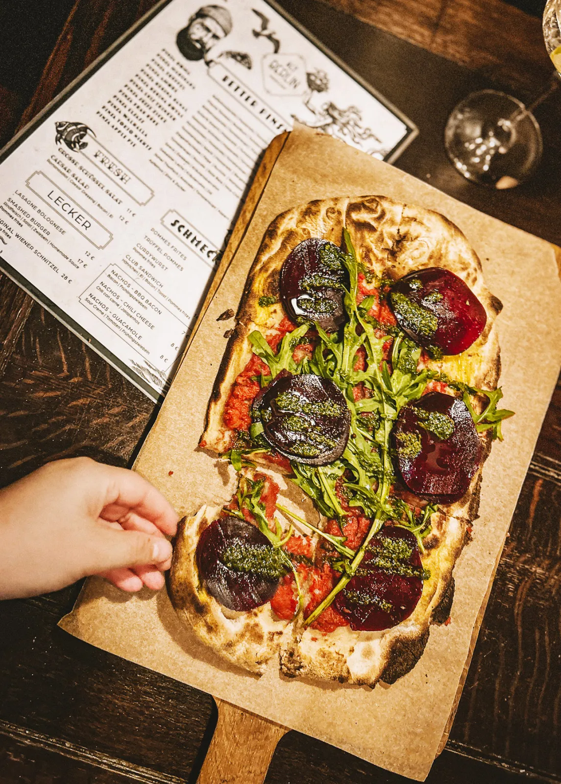 Vegane Pizza schmeckt dir nicht? Dann hast du die Pinten Pinsa im Restaurant Alt Berlin noch nicht probiert. Pinsa ist durch Sauerteig leichter bekömmlich und wird aus Weizen-, Soja- und Reismehl hergestellt. Neben ausgefallenen Pinsa-Namen und Toppings finden sich auch zwei vegane Pinsen auf der Karte. Neben „Frau Rübe“ mit Roter Bete und Chilli-Minz Pesto, ist die süße Variante mit Apfelmus und Zimt und Zucker auch ein echter Renner.