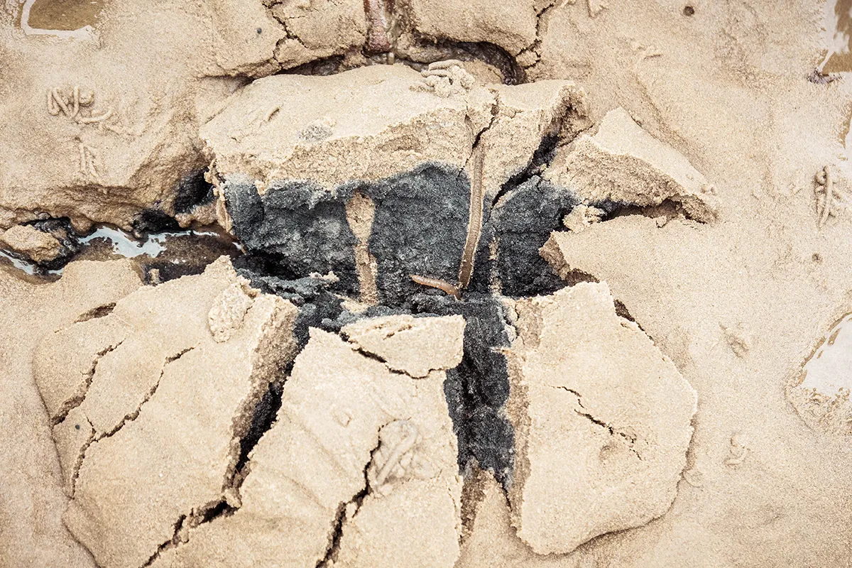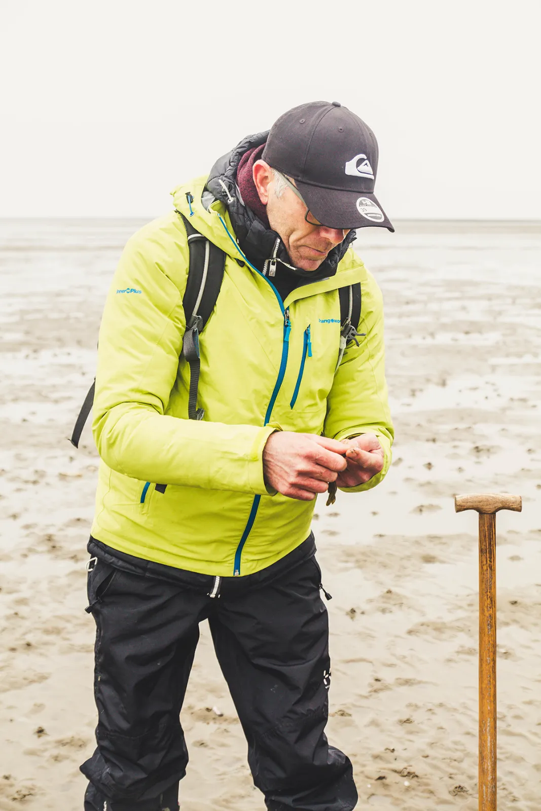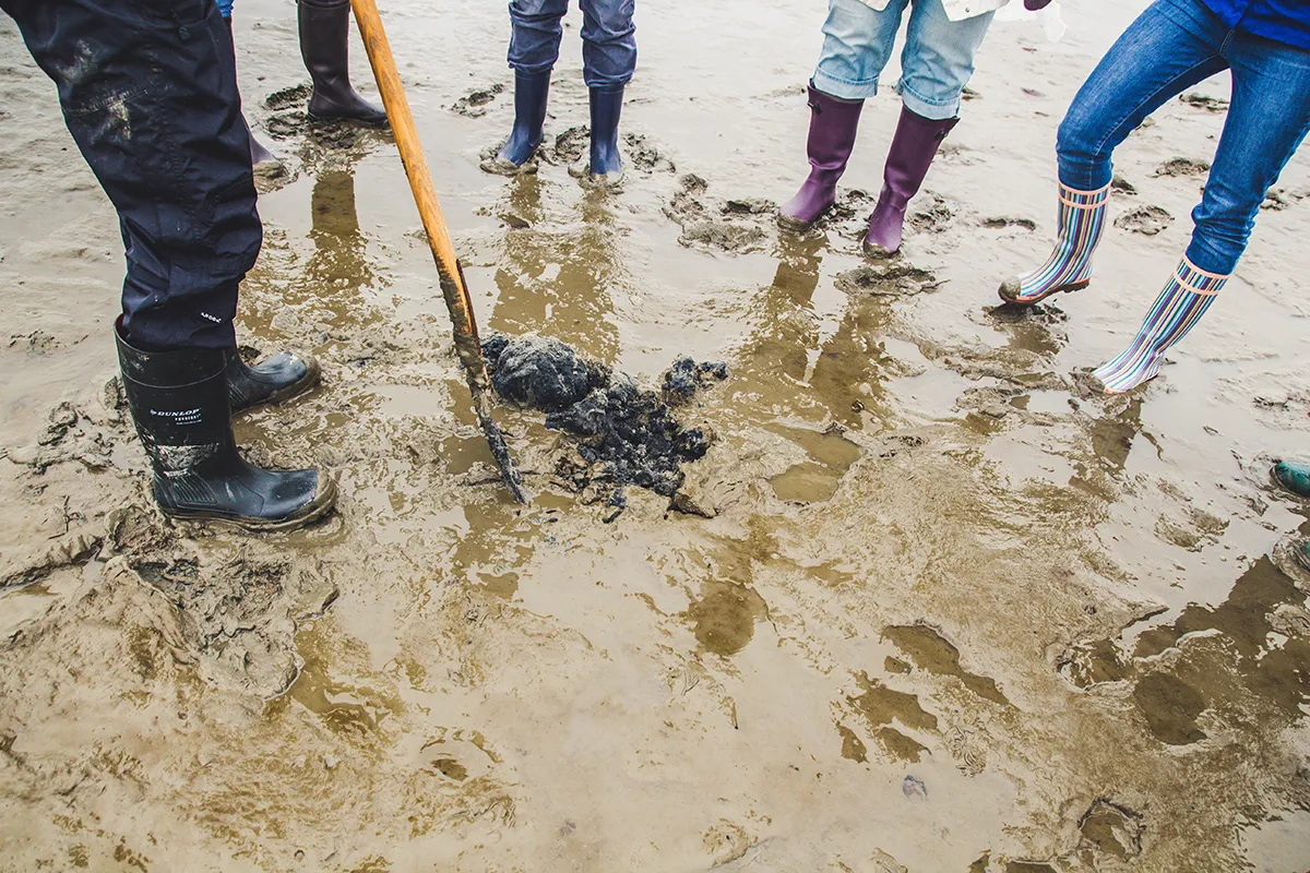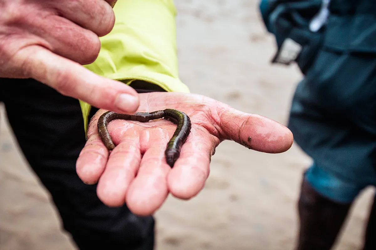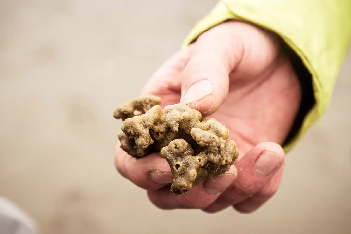 Immer wieder bleiben wir stehen, wenn Jan mit seiner großen Mistgabel kleine Schätze aus dem Schlick zaubert. Brotkrumenschwämme, die wie aufgeweichte Brötchen aussehen, und glibberige, grüne Wurmeier, die als Frühlingsboten der Nordsee gelten. Und dann sind da noch die Wattwürmer, die im Boden ganze Tunnelwelten erschaffen.