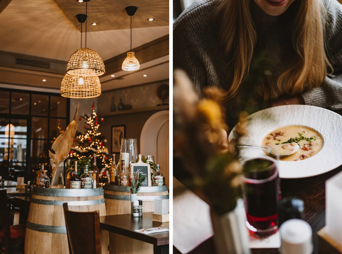 Um unseren kleinen Mittagshunger zu stillen, zieht es uns in das Restaurant Fischhüs in die Strandstraße. Ich habe schon viel von dem Traditionslokal gehört, das 2021 komplett renoviert und umgestaltet wurde. Der Innenraum ist in jedem Fall sehr gemütlich und einladend. Auf der Mittagskarte stehen einfache Gerichte wie Currywurst, Schollenfilet, Schnitzel und Ofenkartoffeln zu fairen Preisen. Ich probiere die Kartoffelsuppe mit Krabben und finde sie echt lecker! Aber auch regionale Klassiker wie Lammhaxe, Rinderrouladen, Nordsee-Seezunge und andere Fischgerichte kannst du hier abends genießen.