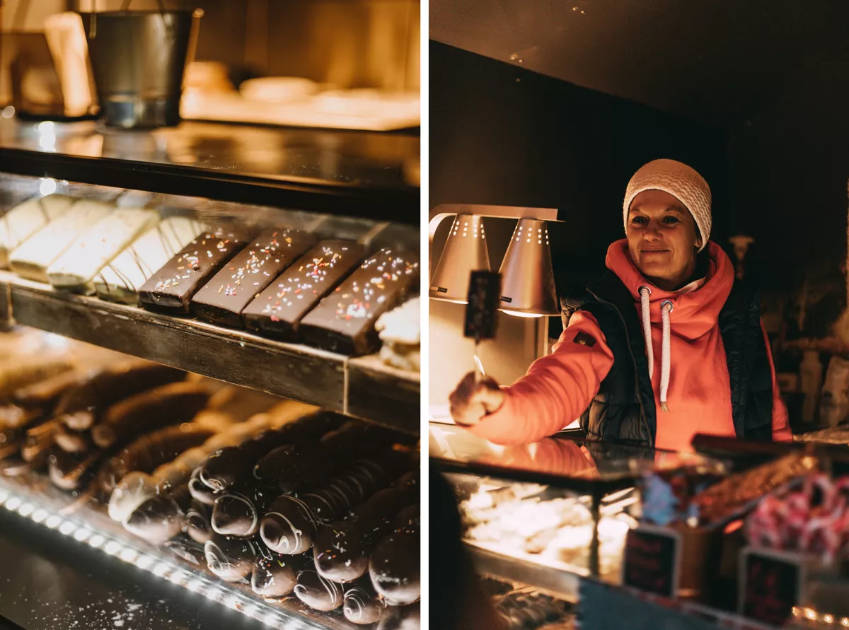 Mit großen Augen schlendere ich also auch in diesem Jahr zwischen den Adventshütten, den liebevoll geschmückten Tannenbäumen und unter einem Lichterhimmel aus Glühlämpchen entlang. Bei dem tollen Angebot an Köstlichkeiten kann ich natürlich nicht widerstehen. Daher schlemmen meine Kollegin Sina und ich uns durch sämtliche Speisen und Glühwein-Kreationen.