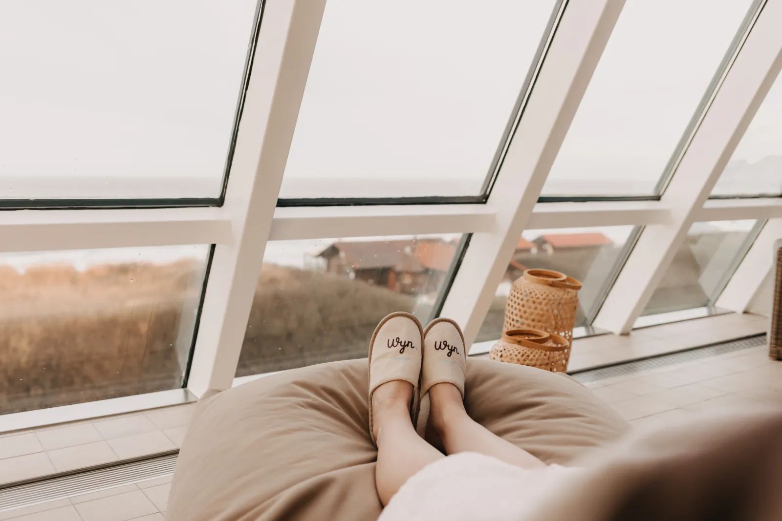 Ich würde behaupten, dass es auf Sylt kaum etwas Vergleichbares gibt. Vor allem jetzt in den Wintermonaten könnte ich mich in dieser heimelig warmen Oase problemlos den ganzen Tag aufhalten. In eine Decke eingekuschelt Tee trinken, lesen, schreiben oder einfach nur aus dem Fenster schauen – richtiges Wohnzimmer-Feeling eben. Und das Beste ist: Sogar in den Saunen verfügen über Meerblick!