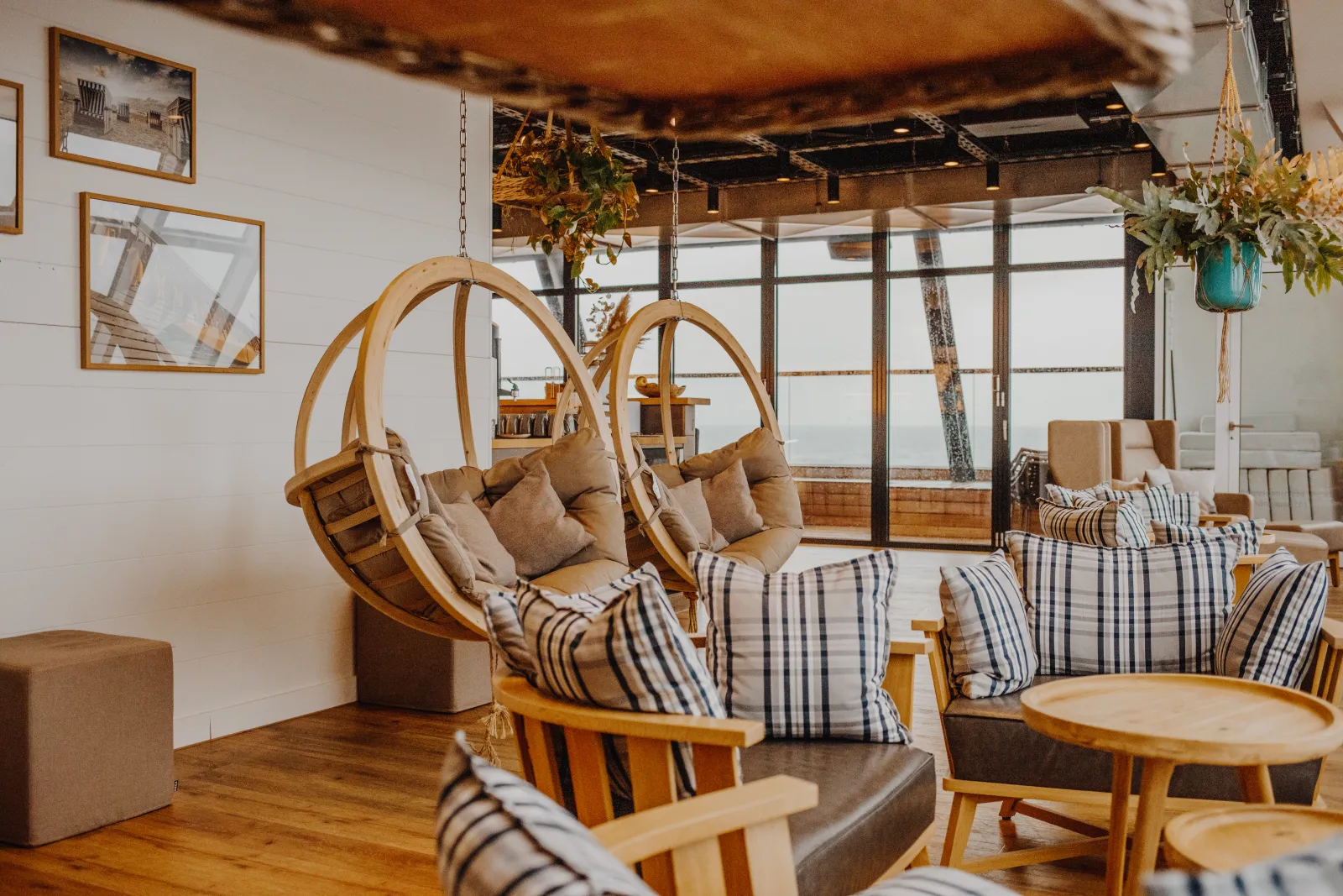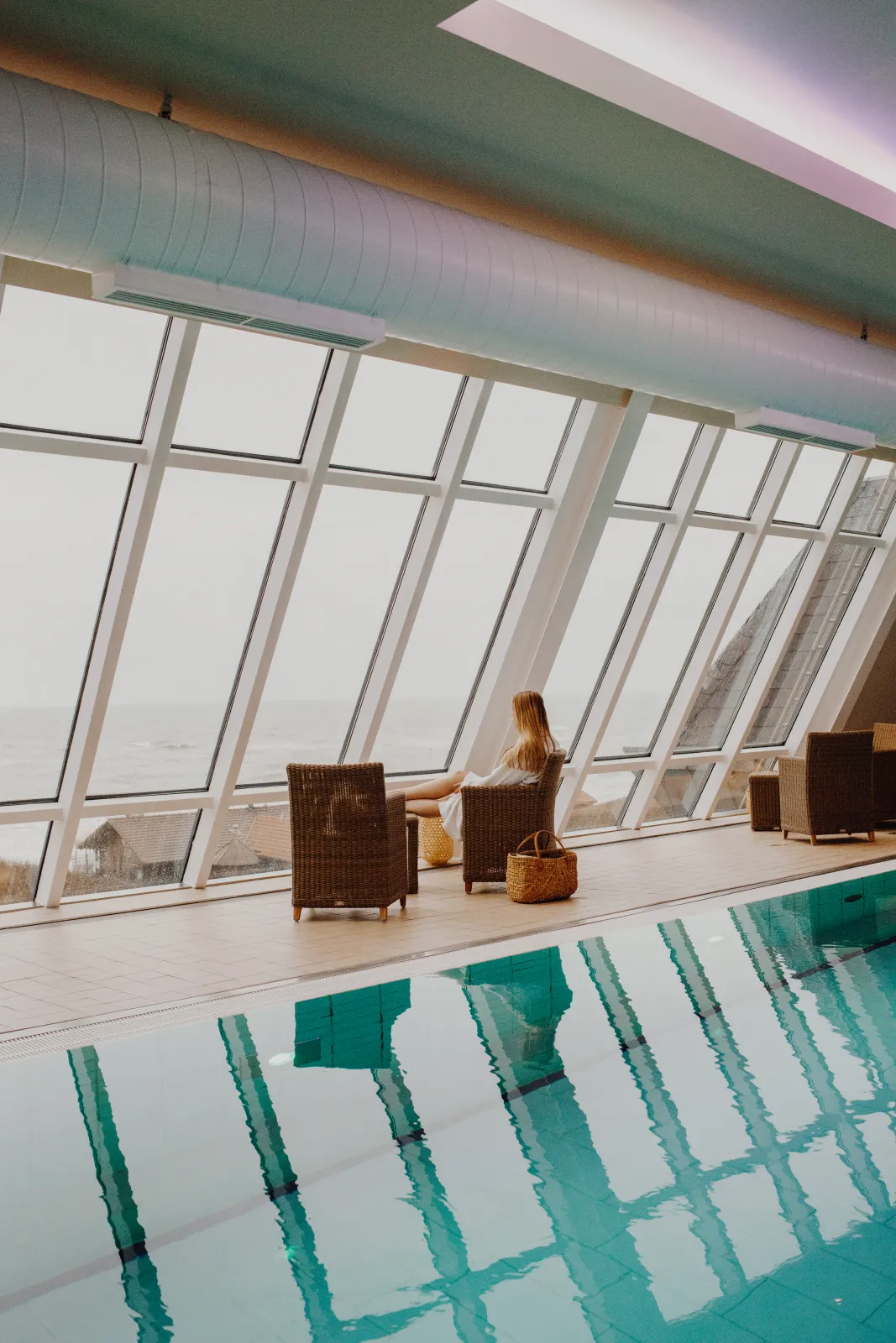 Neben den schönen Zimmern ist die 5. Etage des Hotels mein persönliches Highlight. Denn hier befinden sich ein großer Pool, verschiedene Saunen, ein Fitnessraum und die traumhafte Spa-Lounge – also alles, was man für einen Wellness-Urlaub braucht. Bodentiefe Panoramafenster ermöglichen dir einen atemberaubenden Ausblick auf den Strand und das Meer. Gemütliche Sitzsäcke und Schaukeln laden zum Entspannen ein, eine Bar versorgt dich mit Getränken und im Sommer kannst du sogar auf der Außenterrasse sitzen. Die gesamte Gestaltung finde ich einfach schön, schön, schön!