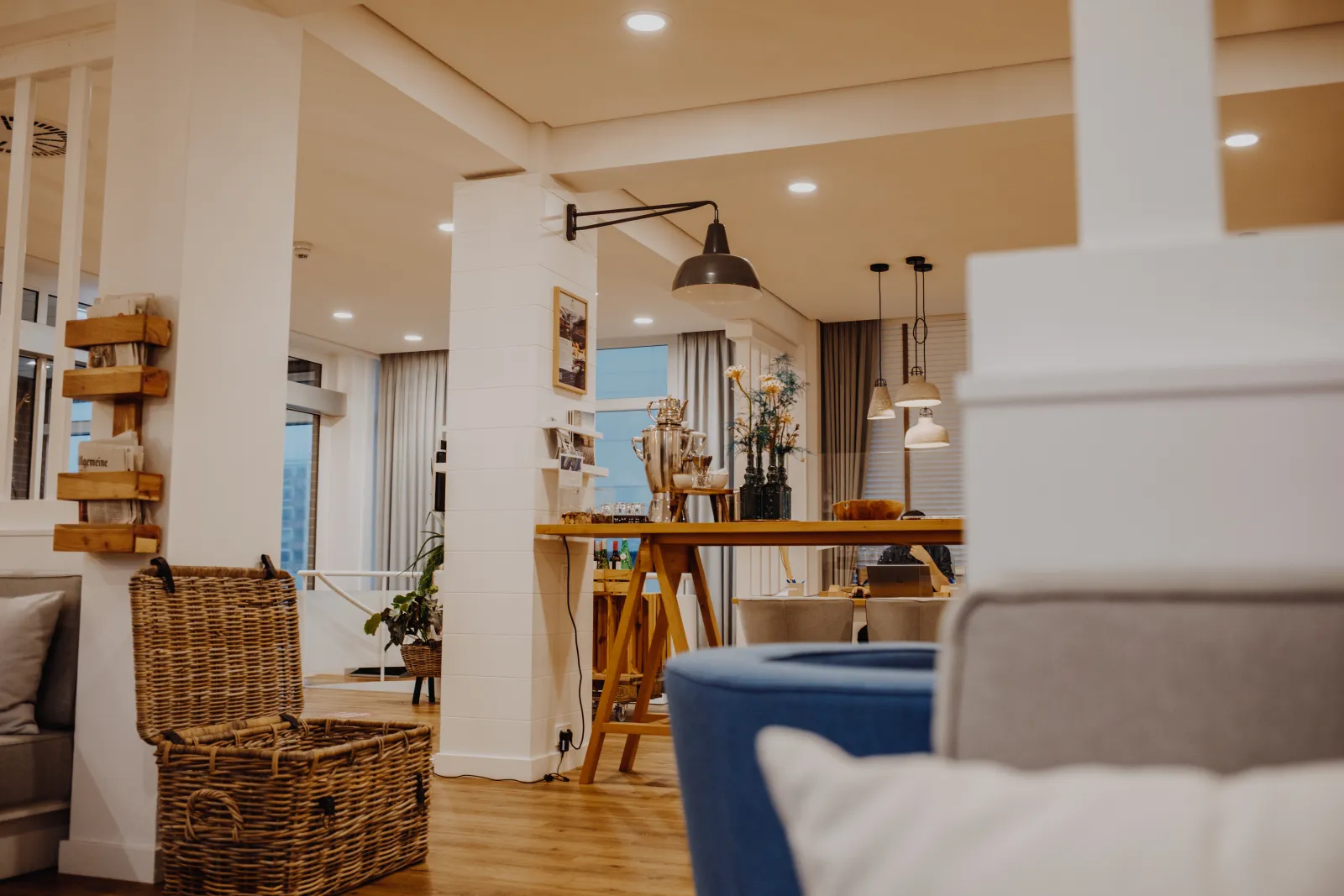 Die hellen, natürlichen Farben, die modernen Möbel und Lampen sowie die farbenfrohen Bilder erinnern viel mehr an das Wohnzimmer eines Strandhauses. Ein lebendiger Aufenthaltsbereich, an dem ganz unterschiedliche Menschen zusammenkommen und eine gute Zeit haben. Kein Wunder, dass es hier so toll aussieht, denn das Hotel hat nach monatelangen Umbauarbeiten und einer kompletten Renovierung erst im Juni 2019 eröffnet.