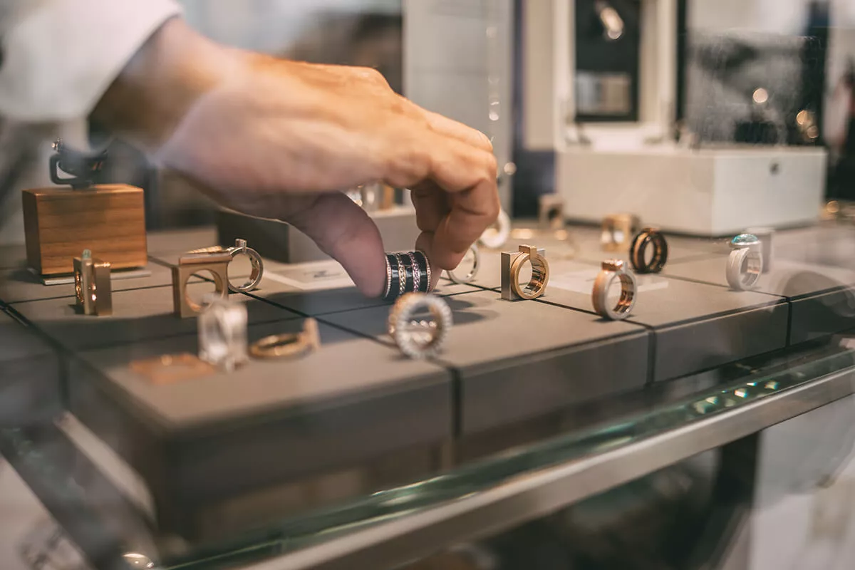 Besonders angetan hat es mir das innovative Ringsystem der Zimmers. „Schichtwechsel“ haben sie es getauft, weil du aus über 30 verschiedenen Ringformen aus 750er-Gelb, Weiß- oder Rotgold oder aus Keramik in unzähligen Varianten unter-, über- und miteinander kombinieren kannst. Es kommen immer wieder neue Designs hinzu. Ich bin ein Fan von individuellen Gestaltungsmöglichkeiten und könnte mich dabei ewig austoben, bis ich meine ganze persönliche Zusammenstellung gefunden habe.
